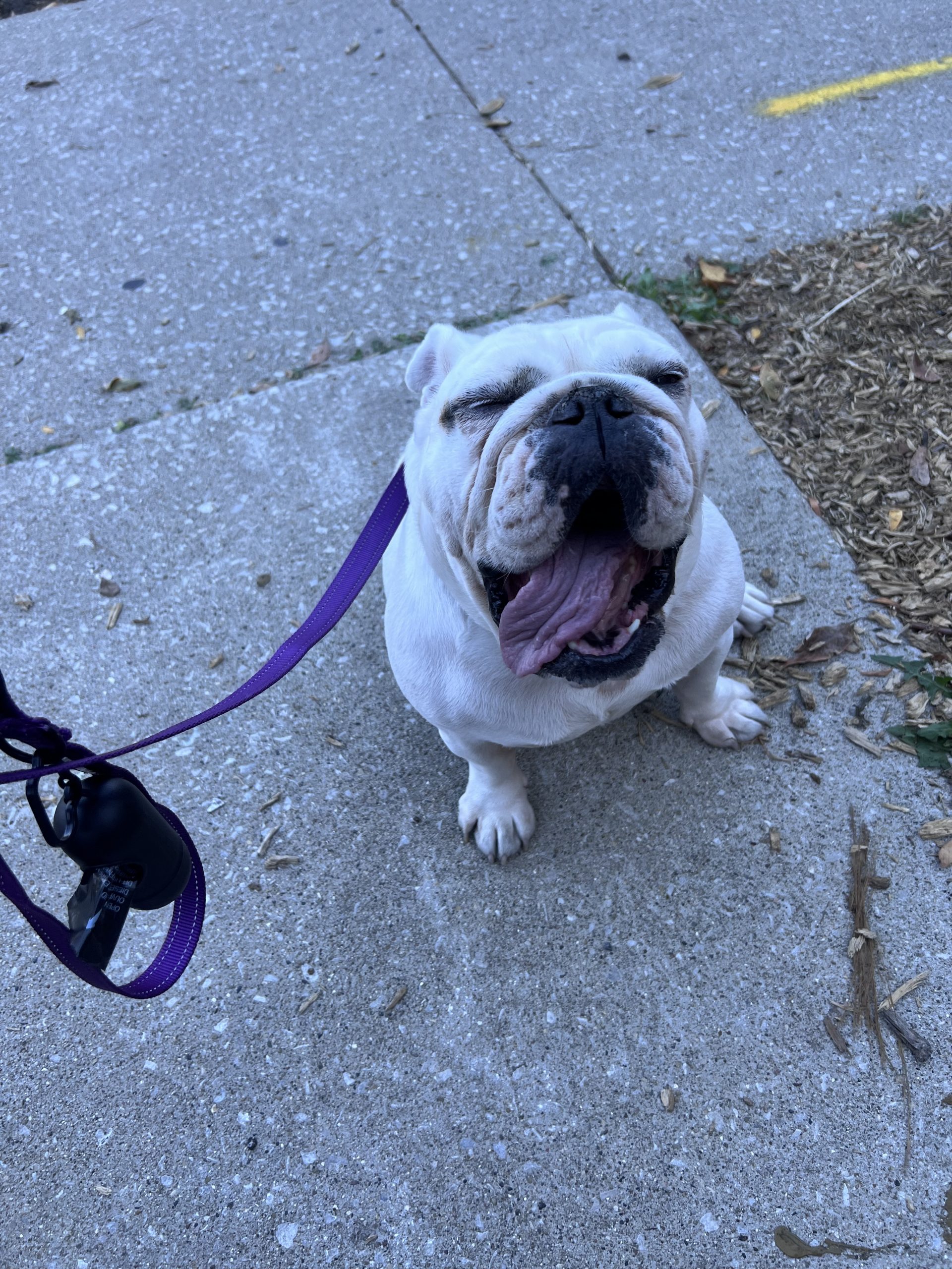 These days, I spend my time soaking up sunshine like I’m at a spa, cuddling like it’s my full-time job, and greeting every person and pup I meet like they’re an old friend. Walks? Parks? Coffee shop patios? Yes, please! I’m the ultimate Chicago explorer. I love the dog park — it’s my happy place — where I get to zoom around, make new furry friends, and show off my best bulldog wiggle.
