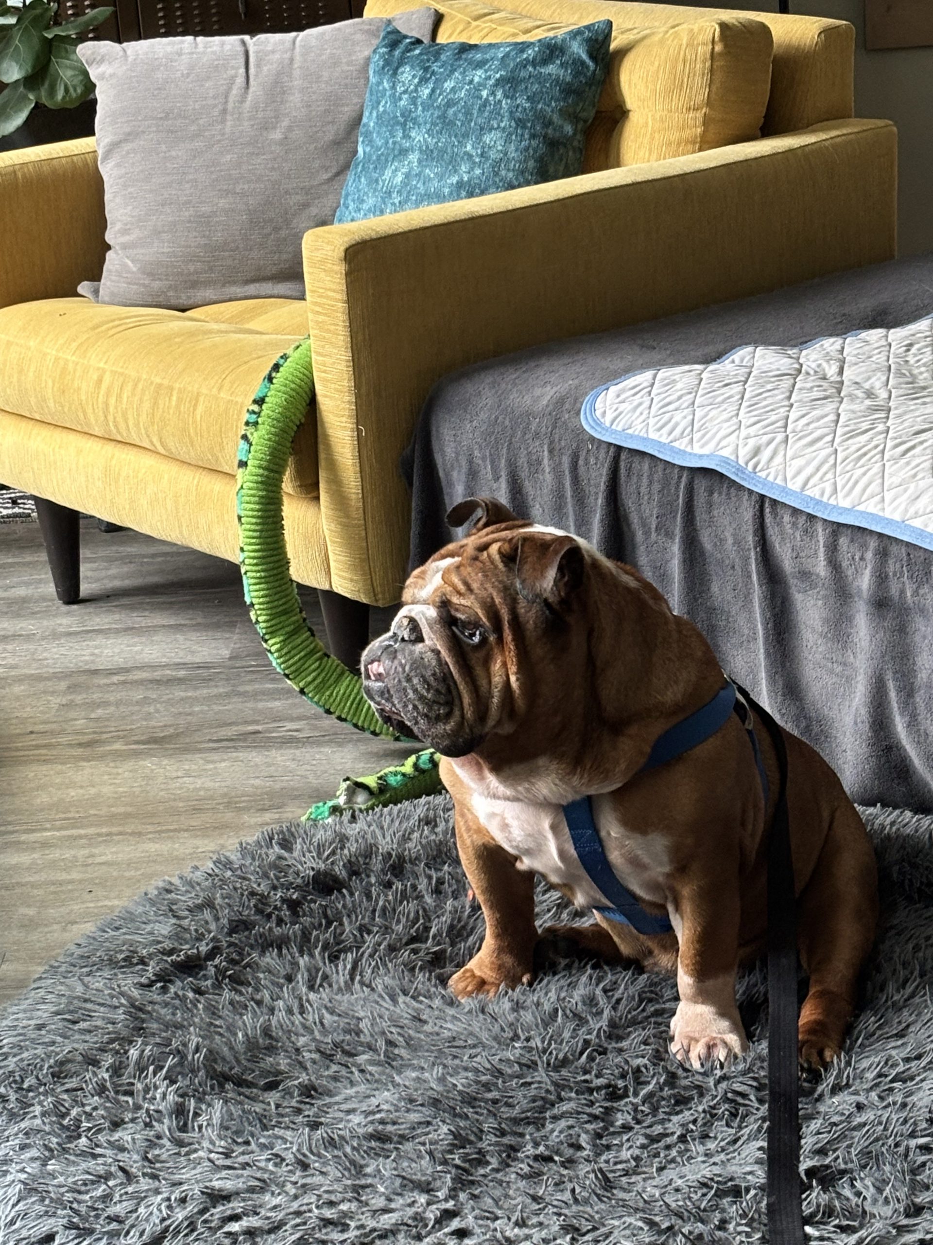 I have three foster brothers that I like following around and watching what they do. I’m more of a sidelines than a jump in the game kinda guy. I also don’t fall for my littlest foster brothers barking, I’m a good boy and don’t join him when he barks at sounds or things he sees outside, in fact the only time I bark is when I have to go potty. I am very good with going potty outside but sometimes I like to walk a bit to get everything done. Or maybe I just like to go for short walks. My foster mom says I am very good on a leash, I am polite and do what she says. I don’t know all my commands yet but I listen well and follow directions. I respond really well when people tell me I’m a good boy and give me some ear scratches.
