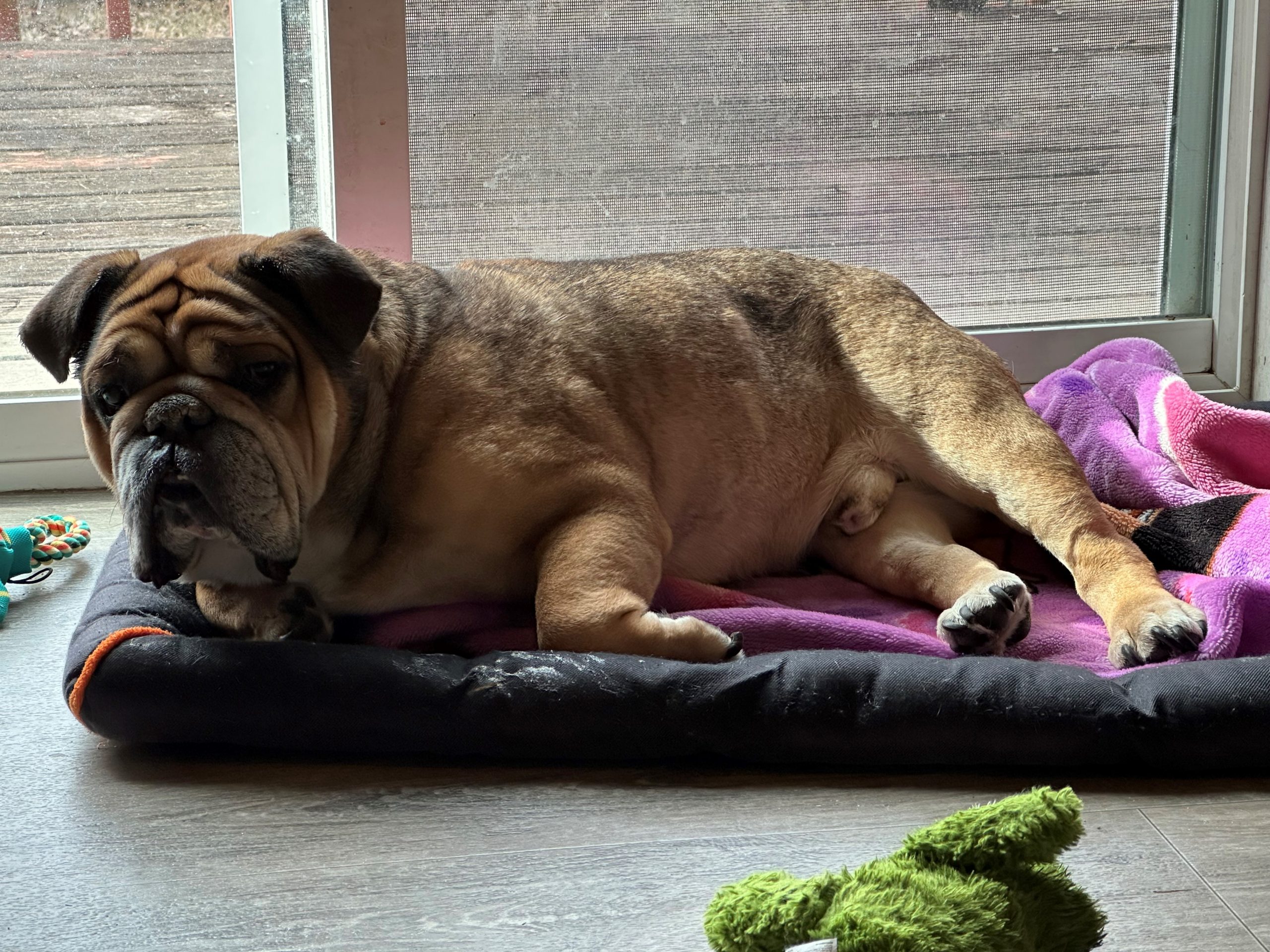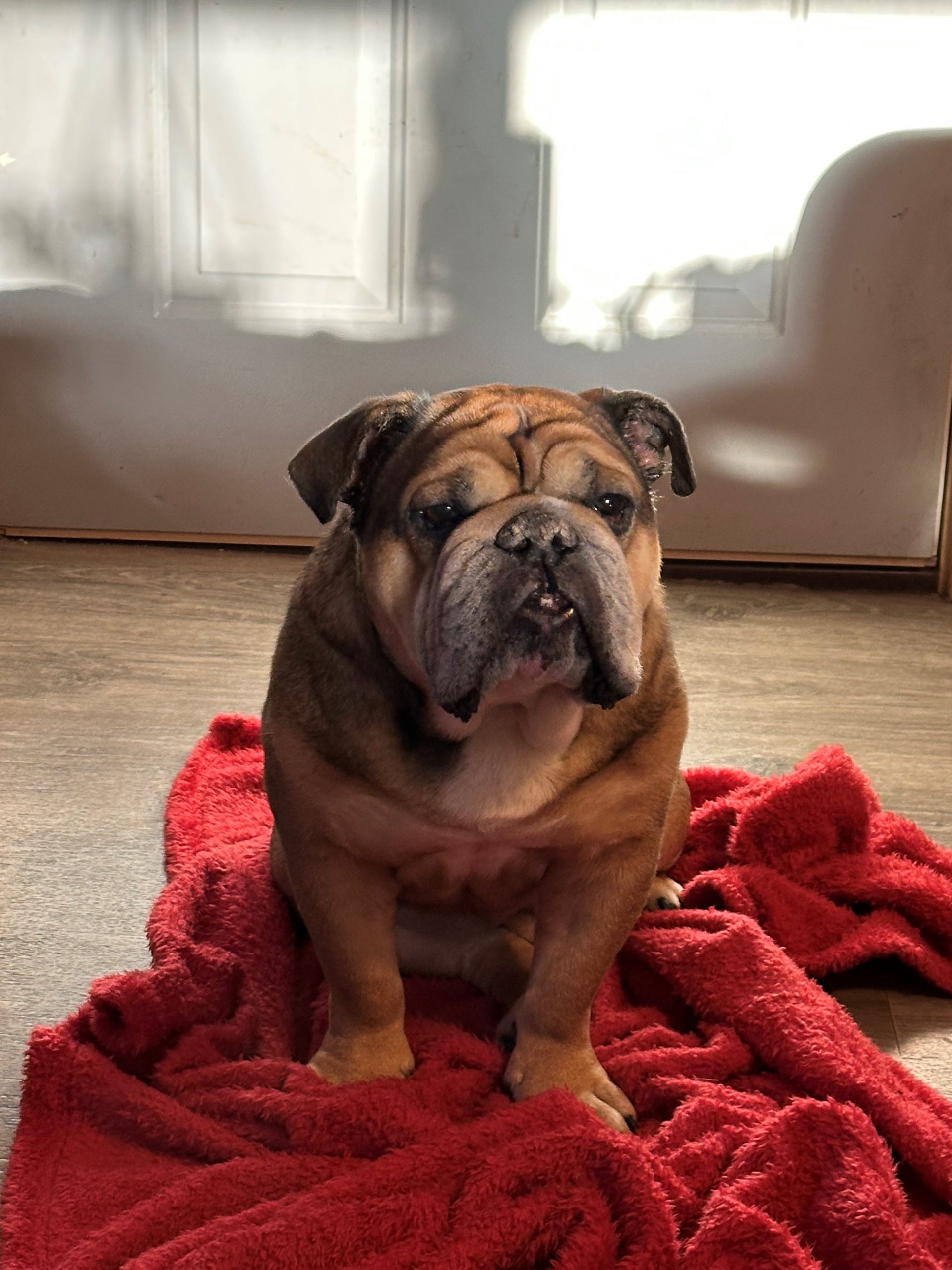 Well hello there… no need to rush. Name’s Dozer, an 8-year-old English Bulldog gentleman weighing in at a solid 50 pounds of pure calm. I’ve traded my wild years for blankets, sunshine, and a good nap schedule and I take that job very seriously. I’m house trained, polite indoors, and very much a fan of the slower pace of life. Car rides? Love them. Hanging outside, soaking up the sun like a baked potato? Absolutely. I’m not here for chaos, I’m here for comfort.