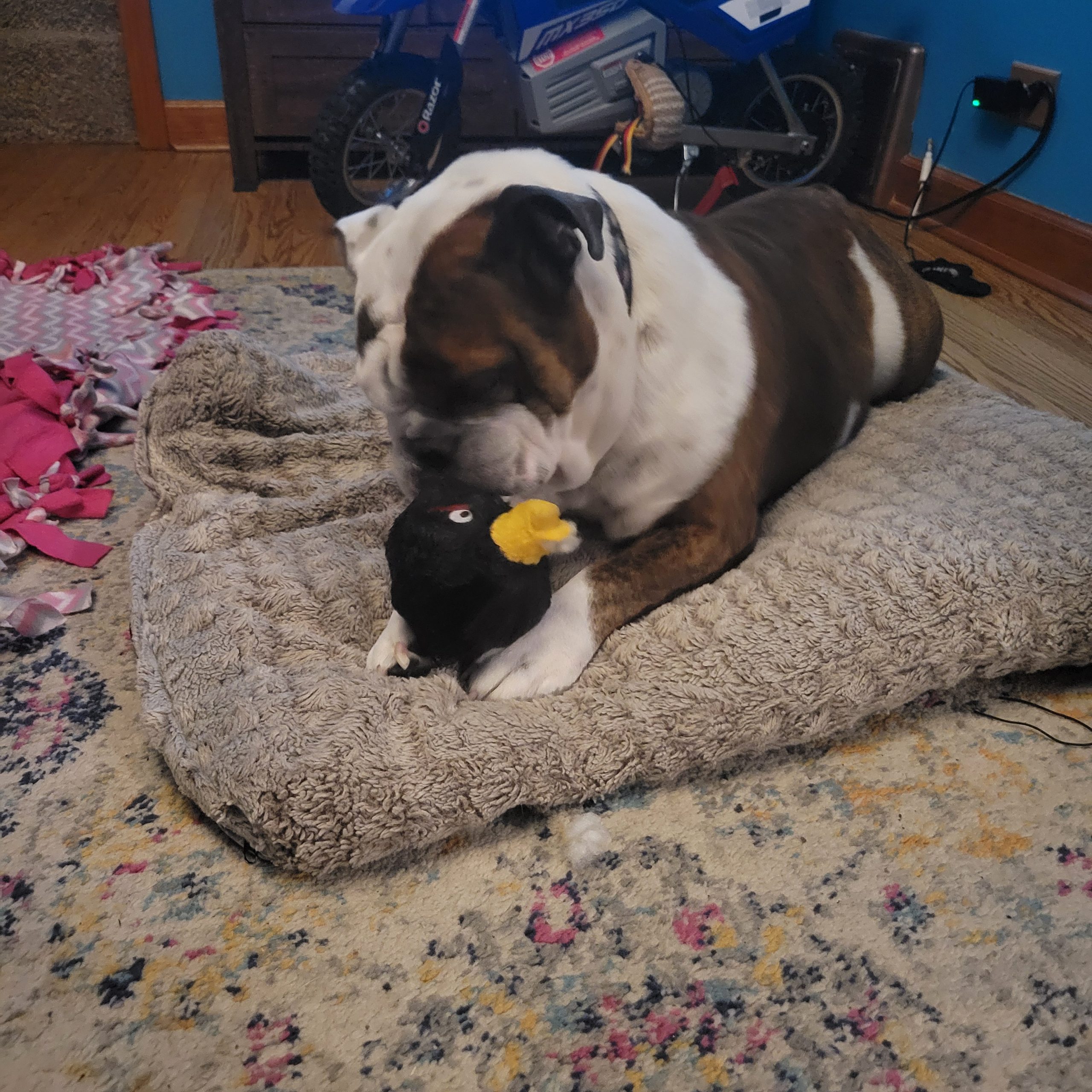 I just celebrated my 8th birthday although my foster mom says she would never believe it if she hadn’t seen my records. I am in wonderful health and I still have lots of energy to play, play, play! My favorite toys are stuffies which I like to use to suckle as well as play catch. I also can chase a soccer ball and basketball like nobody’s business. I can’t figure out why the humans here don’t let me join their team! I am 70 lbs. and some people say that I’m a big boy but I am very respectful of personal space. I don’t need to be on top of you, just being in the same room is fine by me! I love when my foster mom talks to me and I wag my little stubby table every time she comes into the room. I am not a picky guy as far as food goes but I do love people food. Chicken, eggs, hamburgers… I try my best to resist but sometimes I do try my luck to snag a treat when no one is watching. As soon as I’m caught, I go back to being a very good boy and give up my pursuit. I would be great in a home with other dogs or cats or even by myself. Like I said, I’m a very good boy, just happy to have a comfy couch to lay on and be loved.