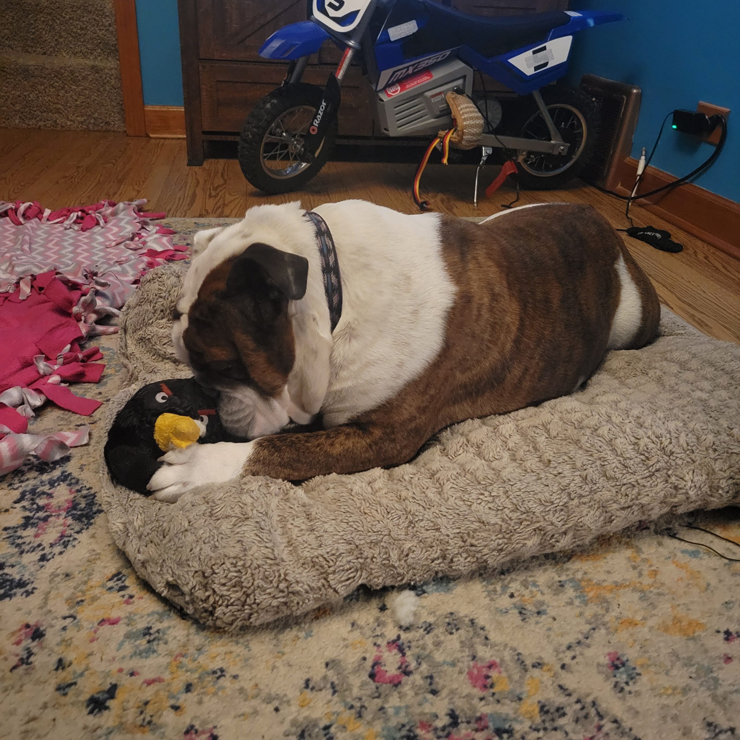 I just celebrated my 7th birthday although my foster mom says she would never believe it if she hadn’t seen my records. I am in wonderful health and I still have lots of energy to play, play, play! My favorite toys are stuffies which I like to use to suckle as well as play catch. I also can chase a soccer ball and basketball like nobody’s business. I can’t figure out why the humans here don’t let me join their team! I am 70 lbs. and some people say that I’m a big boy but I am very respectful of personal space. I don’t need to be on top of you, just being in the same room is fine by me! I love when my foster mom talks to me and I wag my little stubby table every time she comes into the room. I am not a picky guy as far as food goes but I do love people food. Chicken, eggs, hamburgers… I try my best to resist but sometimes I do try my luck to snag a treat when no one is watching. As soon as I’m caught, I go back to being a very good boy and give up my pursuit. I would be great in a home with other dogs or cats or even by myself. Like I said, I’m a very good boy, just happy to have a comfy couch to lay on and be loved.