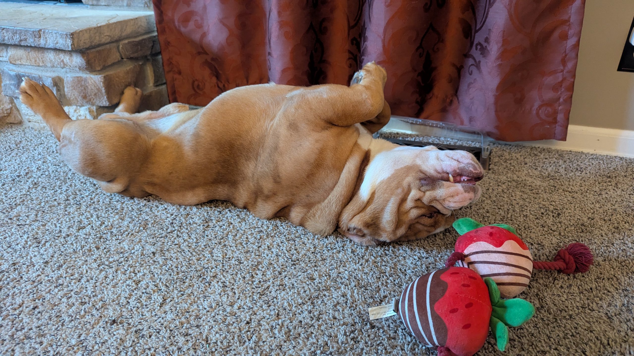 Life has been good since CEBR brought me in. I’ve started to show my personality and plenty of what the humans call puppy energy. I am NOT your typical bulldog. Sure, I have an adorable squishy face, but I love to run. When I can sense it is time to go out for a jaunt, I get SOOOOO excited. I like to test my humans by making it really hard to get my harness on. I don’t mind having it on. I just like to see them work for it. My favorite maneuver is to get hold of the harness in my mouth and not let go.